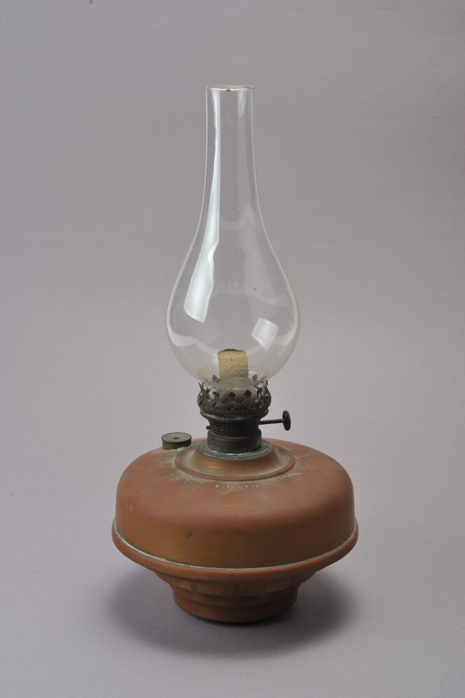BeschrijvingDeze lamp bestaat uit twee losse delen: het reservoir met de lamp zelf en een glazen buis om over de vlam te plaatsen. Op het reservoir staat het opschrift 'Chemin de fer de L'Etat belge'.