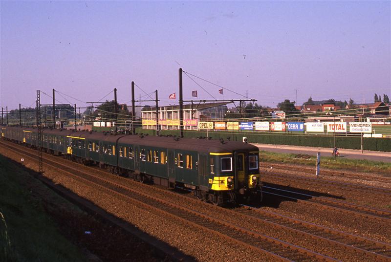 De reizigerstrein is samengesteld uit vier motorstellen met de nummers 030, 029, 016 en 605. Enkel het eerste motorstel (nr. 030) is duidelijk zichtbaar. Dit tweeledig motorstel hoort tot reeks 00, schijf 1950. Van deze reeks werden 25 exemplaren gebouwd in 1950. De kast van dit exemplaar werd door La Brugeoise et Nicaise & Delcuve vervaardigd. De elektrische onderdelen werden door ACEC/SEM geleverd. Het motorstel behaalde een snelheid van 130 km/u en had 168 zitplaatsen (30 eerste klas en 138 tweede klas). Het bestond uit een rijtuig AB (eerste en tweede klas) en een rijtuig BD (tweede klas en bagageruimte). Schenking van Myriam Hendrickx.