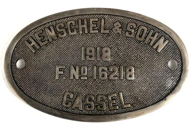 BeschrijvingOvale plaat met als opschrift 'Henschel & Sohn 1918 F. N° 16218 Cassel'. Deze plaat werd door de constructeur ter identificatie aangebracht op het door hem vervaardigde rollend materieel.