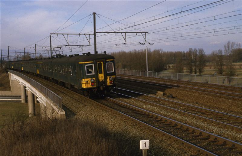 De reizigerstrein bestaat uit vier tweeledige motorstellen, met de nummers 031, 026, 033 en 041. Enkel het eerste motorrijtuig (031) is duidelijk zichtbaar. Dit stel behoort tot reeks 00, schijf 1950. Deze schijf bestond uit 25 exemplaren gebouwd in 1950. De kast van dit exemplaar werd door La Brugeoise et Nicaise & Delcuve vervaardigd. De elektrische onderdelen werden door ACEC/SEM geleverd. Het motorstel behaalde een snelheid van 130 km/u en had 168 zitplaatsen (30 eerste klas en 138 tweede klas). Het bestond uit een rijtuig AB (eerste en tweede klas) en een rijtuig BD (tweede klas en bagageruimte). Schenking van Myriam Hendrickx.