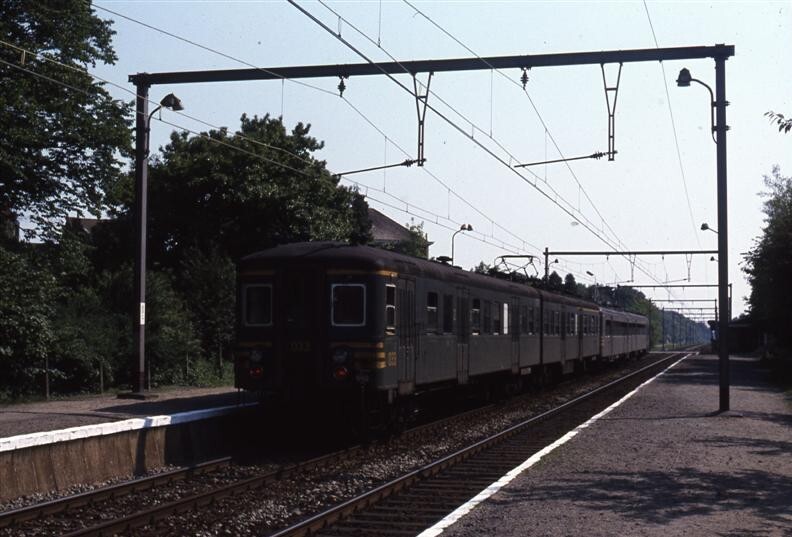 Op de dia zien we de reizigerstrein aan het perron staan in station Heide. Enkel het eerste motorstel (nr. 033) is duidelijk zichtbaar. Het hoort tot reeks 00, schijf 1950. Deze schijf bestaat uit 25 exemplaren gebouwd in 1950. De kast van dit exemplaar werd door La Brugeoise et Nicaise & Delcuve vervaardigd. De elektrische onderdelen werden door ACEC/SEM geleverd. Het motorstel behaalde een snelheid van 130 km/u en had 168 zitplaatsen (30 eerste klas en 138 tweede klas). Het bestond uit een rijtuig AB (eerste en tweede klas) en een rijtuig BD (tweede klas en bagageruimte). Deze motorstellen waren uitgerust met hoge opstappen waardoor ze slechts konden ingezet worden op lijnen met hoge perrons. Hun inzet bleef beperkt tot de lijnen Brussel - Antwerpen - Essen en Brussel - Charleroi. Schenking van Myriam Hendrickx.