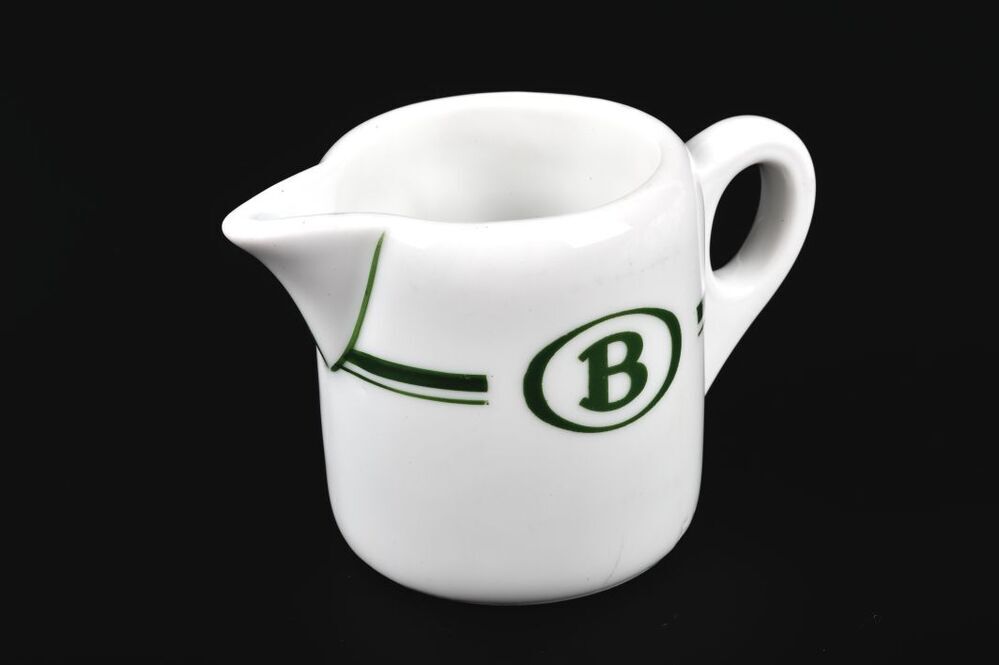 BeschrijvingWit kannetje met een dubbele groene bies en het NMBS-logo. Ook aan het oor en de schenktuit zijn groene biezen.