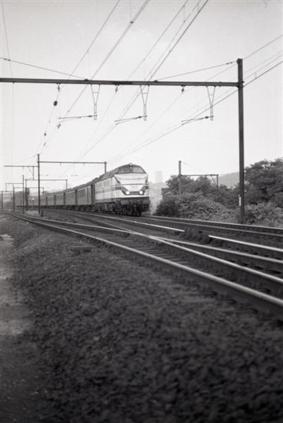 Op de foto zien we een reizigerstrein bestaande uit diesellocomotief 5142 en enkele K-rijtuigen. De locomotief behoorde tot reeks 51 (ex-type 200). Deze reeks werd tussen 1961 en 1963 geleverd door de Belgische constructeur Cockerill. De zesassige locomotieven, voorzien van een 2000 pk sterke motor, hadden een toegelaten snelheid van 120 km/u (voor het trekken van TEE-treinen 140 km/u). Ze waren bestemd voor zowel het reizigersverkeer als het goederenvervoer. Schenking van Myriam Hendrickx.