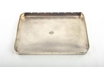 BeschrijvingRechthoekige schotel met een opstaande gekartelde rand. In het midden is het NMBS-logo gegraveerd.