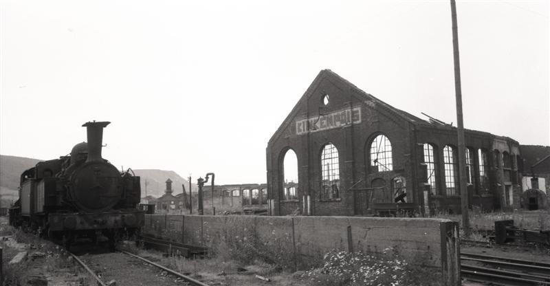 TitelStoomlocomotief 9262 voor de ruïnes van de werkplaats Kinkempois