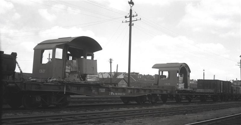 Deze foto werd gemaakt bij de stelplaats van Antwerpen-Dam en toont twee stuurcabines van stoomlocomotieven die elk op een platte wagen staan. Stuurcabine CB27 staat op een Duitse wagen met als opschrift 'X DR Ru Köln 50649 SSyl'. De andere stuurcabine heeft het nummer CB25. Ze zijn waarschijnlijk beide afkomstig van het type 29.