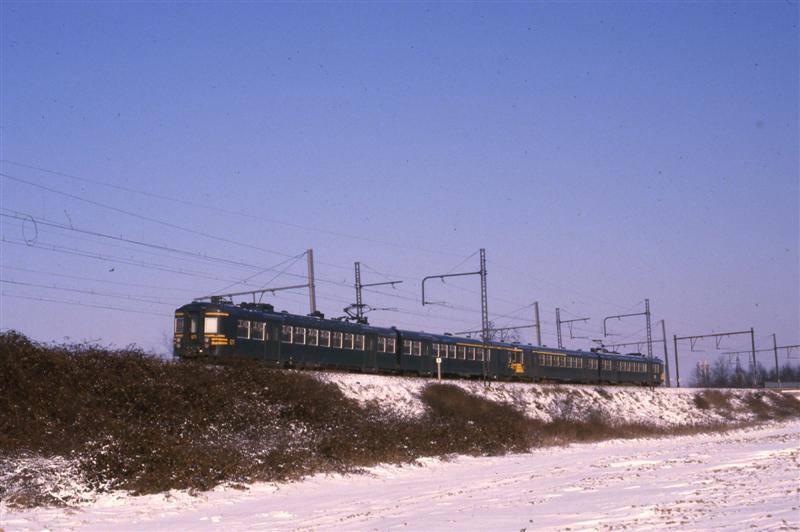 De reizigerstrein bestaat uit twee tweeledige motorstellen met de nummers 671 en 679. Vooral het eerste (motorstel 671) is duidelijk zichtbaar. Het behoort tot reeks 06 schijf 1970 TH. De 12 exemplaren van deze schijf (nr. 665 tot 676) werden in 1971-'72 gebouwd door de Centrale Werkplaats van Mechelen. De elektrische onderdelen werden door ACEC geleverd. De motorstellen werden uitgerust met een thyristor uitrusting (TH). Zij hadden een maximumsnelheid van 140 km/u en als samenstelling een rijtuig B (tweede klas) en een rijtuig ABD (eerste klas, tweede klas en bagageruimte). De originele livrei is donkergroen met geel, maar vanaf 1984 werden ze bordeaux met een heldergrijze band over de rijtuigkast en gele zichtbaarheidstrepen op de stuurposten geschilderd. Schenking van Myriam Hendrickx.