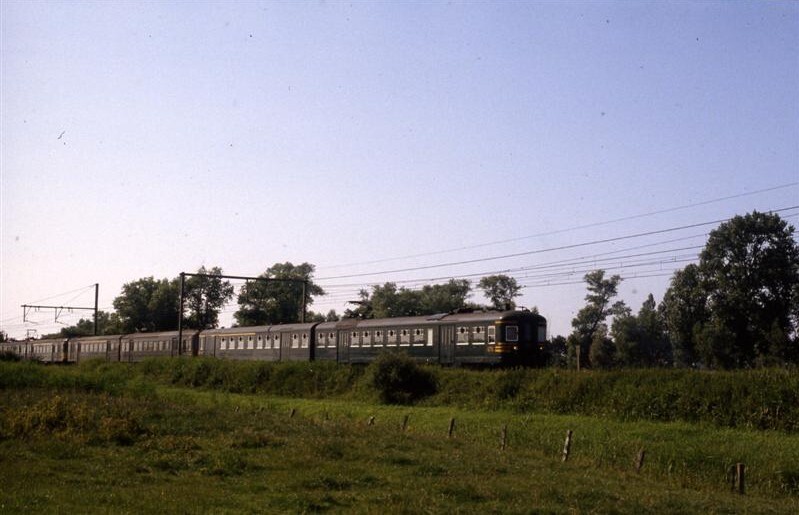 De reizigerstrein bestaat uit drie tweeledige motorstellen met de nummers 676, 535 en 534. Vooral het eerste (motorstel nr. 676) is duidelijk zichtbaar. Het behoort tot reeks 06 schijf 1970 TH. De 12 exemplaren van deze schijf (nr. 665 tot 676) werden in 1971-'72 gebouwd door de Centrale Werkplaats van Mechelen. De elektrische onderdelen werden door ACEC geleverd. De motorstellen werden uitgerust met een thyristor uitrusting (TH). Ze halen een maximumsnelheid van 140 km/u en hebben als samenstelling een rijtuig B (tweede klas) en een rijtuig ABD (eerste klas, tweede klas en bagageruimte). De originele livrei was donkergroen met geel, maar vanaf 1984 werden ze bordeaux met een heldergrijze band over de rijtuigkast en gele zichtbaarheidstrepen op de stuurposten geschilderd. Schenking van Myriam Hendrickx.