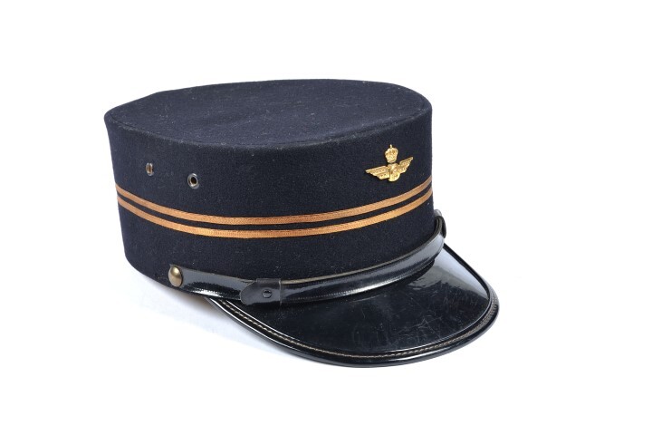 BeschrijvingZwarte kepie met zwarte/groene klep in kunststof. De stormband is van kunststof en vastgemaakt met twee ronde metalen knopen. Er lopen twee gouden biezen op 3.5 en 4.5 cm boven de rand. Vooraan is een spoorweginsigne aangebracht. De kepie werd verstevigd met een leren band en de voering is beige.