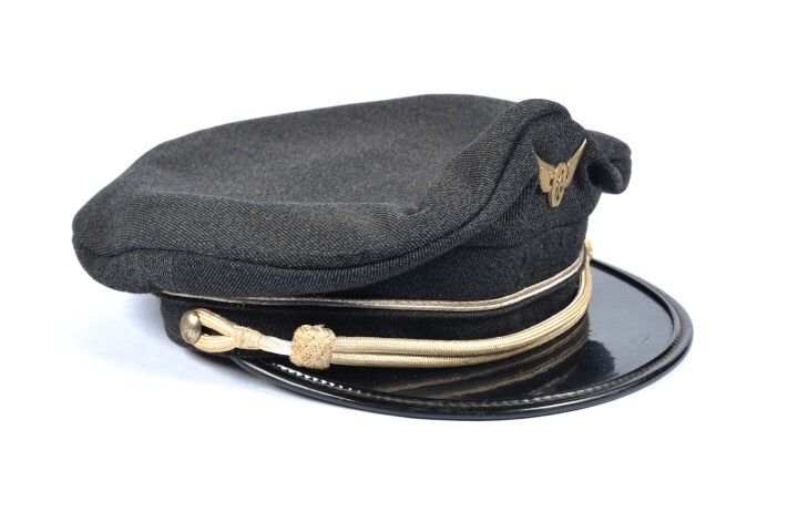 BeschrijvingDonkergrijze dienstpet met een zwarte klep in kunststof. Boven de klep bevindt zich een dubbele zilverkleurige koord, vastgehangen met twee metalen knopen. Er loopt een zilverkleurige bies op 2 cm boven de rand. Aan de voorzijde bevindt zich een spoorweginsigne van een gevleugeld wiel. De pet is verstevigd met een leren band en de voering is rood.