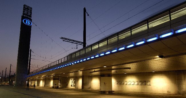 BeschrijvingFoto van het viaduct bij Brussel-Zuid met zicht op de totem.