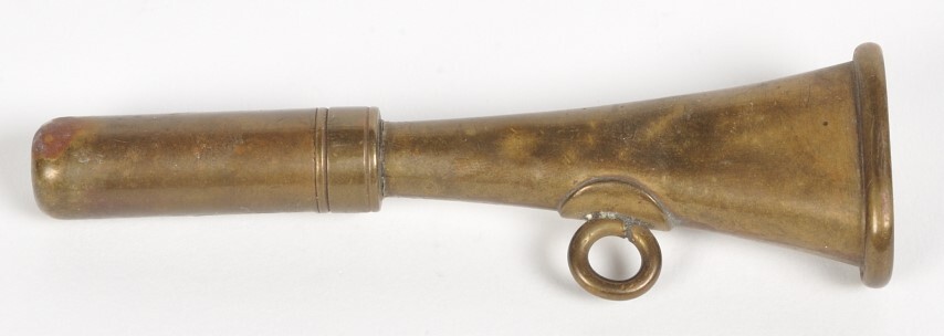 BeschrijvingDeze hoorn werd door baanbedienden en rangeerders gebruikt als mobiel sein. Het heeft een metalen lus waar men een touw aan kon bevestigen.