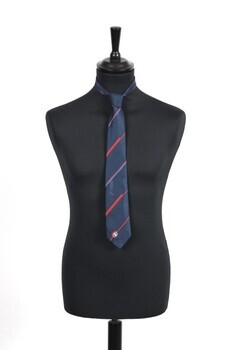 BeschrijvingDonkerblauwe das met rode en lichtblauwe diagonale strepen en het NMBS-logo in het wit. Deze dassen hoorden bij de donkerblauwe uniformen die tot het einde van de jaren 1990 gedragen werden.