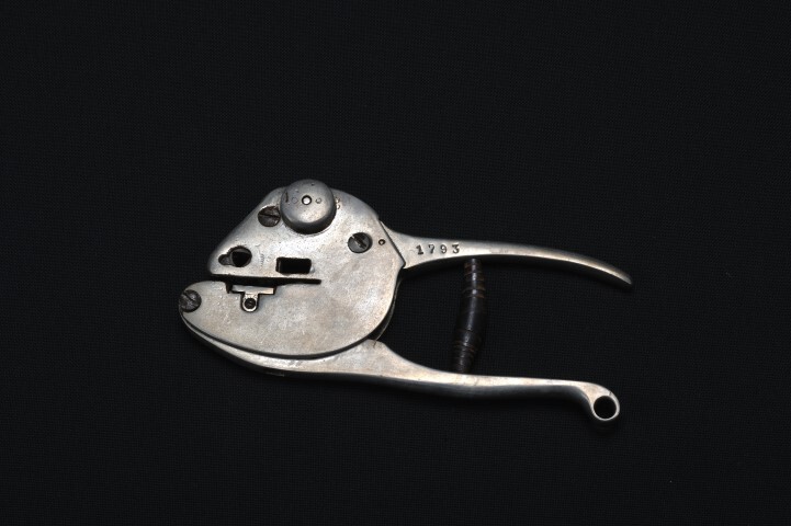 2019-07-1307:49:36G.C.van StraatenDit is een kniptang van het fabrikaat "Emile Terfvé", ontworpen vòòr het in de tekst genoemde jaar 1932 en beter bekend van het stadsvervoer te Brussel. De tang heeft een beveiliging: hij kan alleen dichtgeknepen worden als er een kaartje in de gleuf gestoken is, ieder knip wordt geregistreerd door een telwerk bovenop. De tang kon boven het gaatje twee cijfers in het kaartje pregen, beide van 0 1 ... 8 9 instelbaar. Als ik het goed heb onthouden zijn deze tangen in 1928 in Brussel ingevoerd. Ook de Haagse tram in Nederland gebruikte ze.