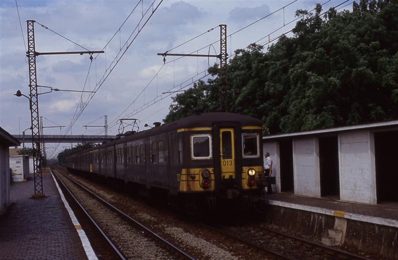 De trein bestaat uit tweeledige motorstellen. Enkel het eerste stel, nummer 013, is goed zichtbaar. Dit motorstel behoort tot reeks 00, schijf 1950. Van deze schijf werden 25 exemplaren gebouwd in 1950. De kast werd door La Brugeoise et Nicaise & Delcuve vervaardigd. De elektrische onderdelen werden door ACEC/SEM geleverd. Deze motorrijtuigen behaalden een snelheid van 130 km/u en hadden 168 zitplaatsen (30 eerste klas en 138 tweede klas). De stellen bestonden uit een rijtuig AB (eerste en tweede klas) en een rijtuig BD (tweede klas en bagageruimte). Schenking van Myriam Hendrickx.