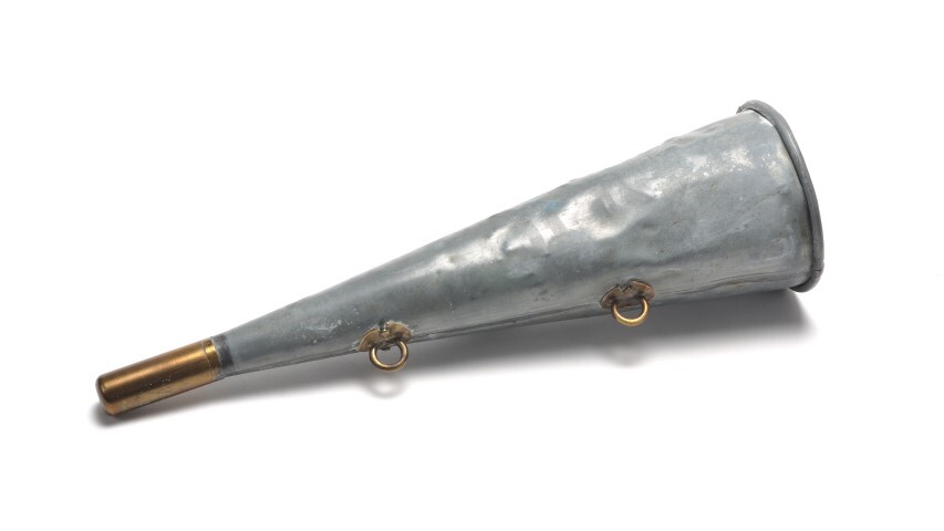 BeschrijvingDit mobiel sein werd door de schildwacht gebruikt om spoorleggers te waarschuwen voor het naderen van een trein of ander gevaar. Men kon een draagriem bevestigen aan de hoorn.