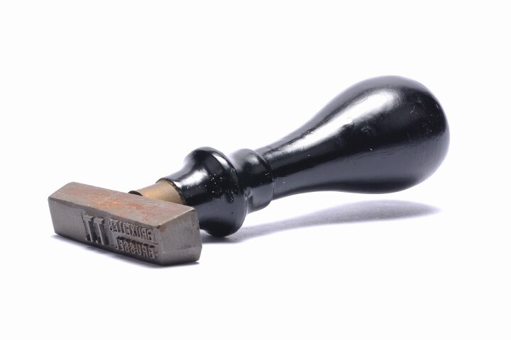 TitelMetalen stempel 'Bruxelles Brussel T.T. ' met houten handvat