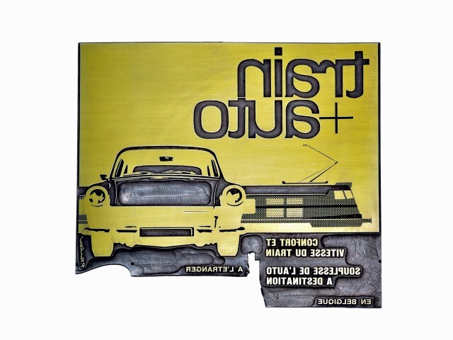 Deze metalen drukplaat toont een zijzicht van een elektrische locomotief met daarvoor een auto in vooraanzicht. Bovenaan staat 'train +auto' in grote letters. Onder de afbeelding staat in kleine letters 'confort et vitesse du train souplesse de l'auto à destination en belgique à l'étranger'.