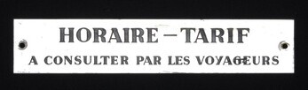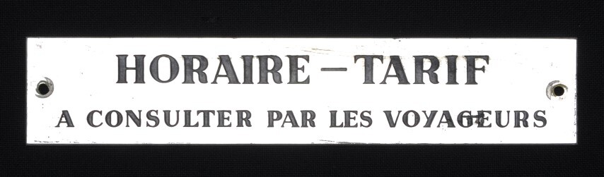 BeschrijvingAluminium bord met zwarte letters dat in de stations boven de informatieborden met de dienstregeling en tarieven werd gehangen.