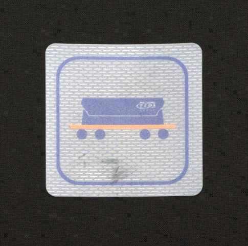 BeschrijvingOp dit doorzichtige bordje staat een gestileerde afbeelding van een goederenwagen in de kleuren blauw en oranje. Rond de tekening werd een blauwe kader aangebracht.