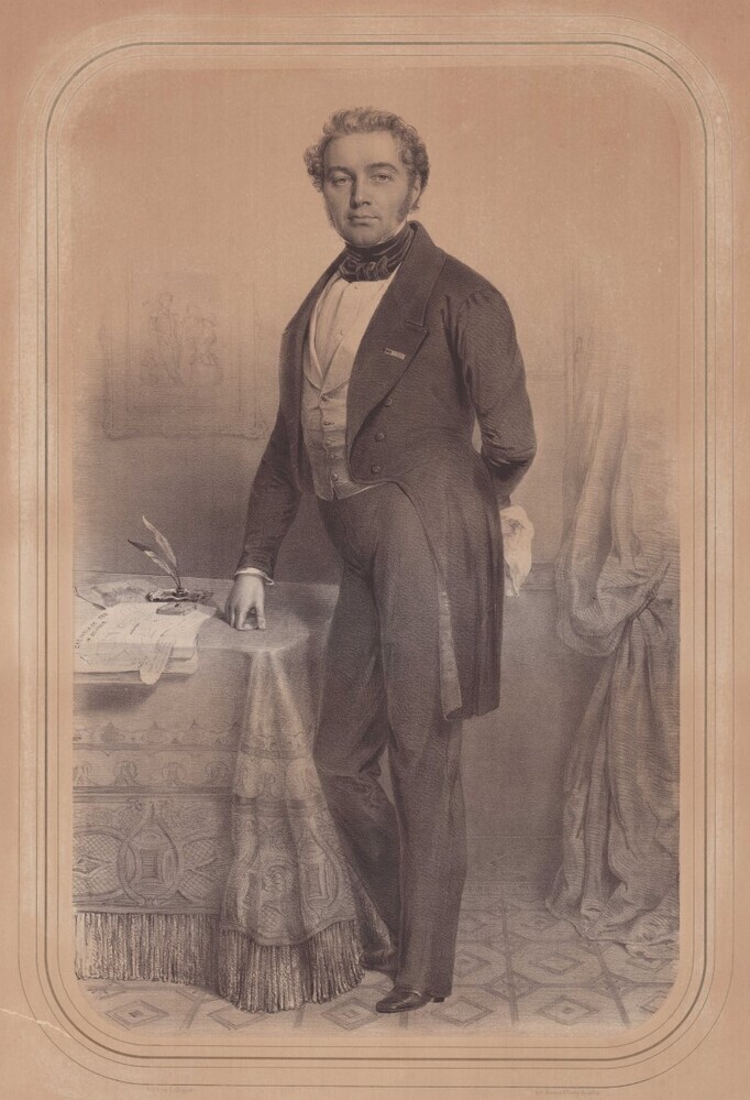BeschrijvingJean-Baptiste Masui (1798-1860) was de eerste directeur-generaal van de Belgische spoorwegen en posterijen. Op dit zwart-witportret zien we hem staande naast zijn bureau.