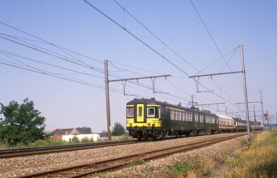 Deze fotogroep bevat drie dia's. Motorstel 050 (oorspronkelijk nummer 151) behoort tot reeks 00, schijf 1962/1963. Aan het motorstel zijn een meetrijtuig en de tweeledige motorstellen 158 en 600 gekoppeld. Op 11 juni 1987 verliet motorstel 151 na ombouw de CW Mechelen als prototype met driefasige elektrische aandrijving. Het motorstel kreeg toen het nummer 050’’’. Het ontving ook volledig nieuwe draaistellen met pneumatische ophanging en driefasige asynchrone tractiemotoren. In 1993 volgde de terugbouw naar de standaarduitvoering. De motorstellen 050 en 158 zijn groen geschilderd met gele zichtbaarheidsstrepen. Het Sabena-treinstel 600 is uitgerust met een blauwe kleur en een brede witte band. Schenking van Myriam Hendrickx.
