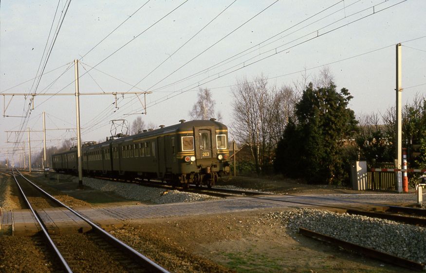 Motorstel 263 behoort tot reeks 00, schijf 1965. Van deze schijf werden 20 exemplaren, genummerd van 251 tot 270, gebouwd in 1965. Het grote voordeel van deze motorstellen is dat ze langs beide kanten een stuurpost hebben, waardoor rangeren overbodig wordt. Het motorstel bestond uit een rijtuig ABD (eerste klas, tweede klas en bagageruimte) gebouwd door Ragheno. Het rijtuig B (tweede klas) werd vervaardigd door La Brugeoise et Nivelles (BN) / Les Usines de Braine-le-Comte (BLC). De elektrische onderdelen werden door ACEC (Charleroi) geleverd. Het motorstel kon een snelheid van 130 km/u behalen en had 180 zitplaatsen (28 eerste klas en 152 tweede klas). Schenking van Myriam Hendrickx.