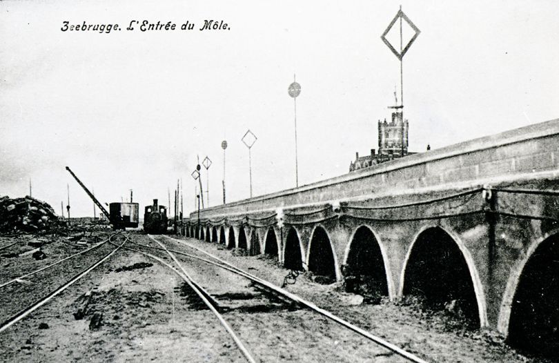 Reproductie van een postkaart met als opschrift 'Zeebrugge. L'Entrée du Môle'. We zien de sporen van een werflijn met daarop een stoomtrein en een kraanwagen. Naast de spoorlijn zien we de havendam.