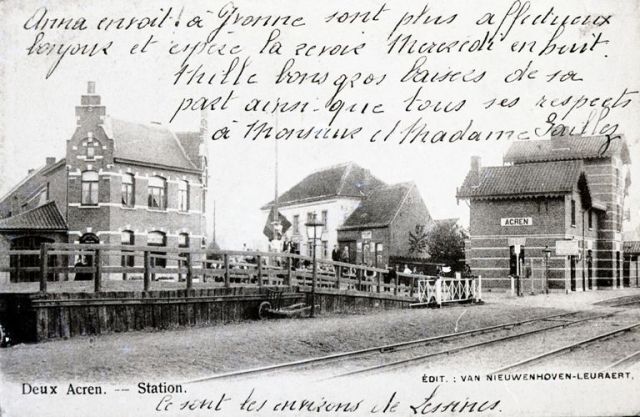 Reproductie van een postkaart met opschrift 'Deux Acren. Station. édit.: Van Nieuwenhoven-Leuraert.' We zien de zij- en een deel van de voorgevel van het stationsgebouw. Aan de overweg staan enkele personen op een verhoogd platform. Op de voorzijde van de postkaart werd met de hand een boodschap geschreven.