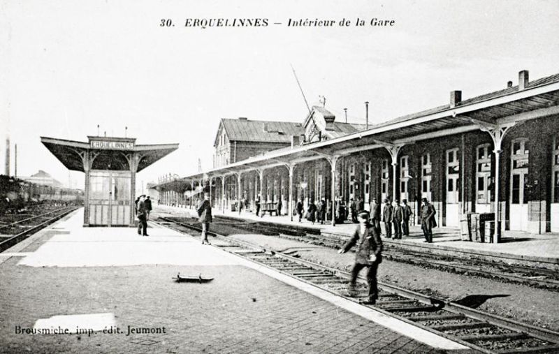 Reproductie van een postkaart met als opschrift '30. Erquelinnes - Intérieur de la Gare Brousmiche. imp. édit. Jeumont'. We zien het perron en de achtergevel van het station, getrokken van op de sporen. Het stationspersoneel poseert op het eerste perron. Een schuilhuisje staat op het tussenperron.