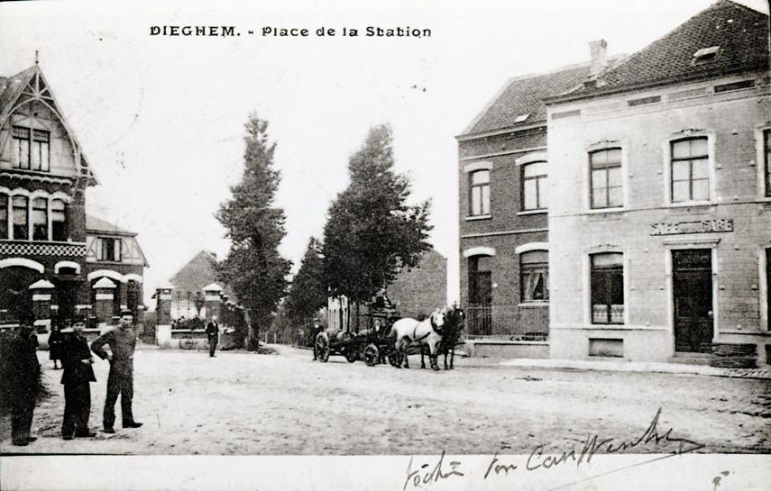 Reproductie van een postkaart met als opschrift 'Dieghem. - Place de la Station'. De postkaart toont het pleintje voor het station van Diegem met een paardenkar en enkele voorbijgangers. Het station zelf wordt niet afgebeeld. Onderaan staat een met de hand geschreven boodschap.