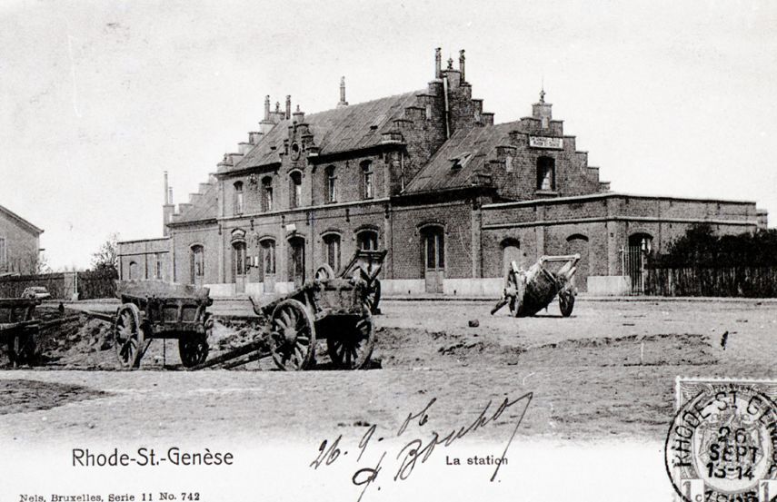 Reproductie van een postkaart met als opschrift 'Rhode-St.-Genèse La station Nels. Bruxelles. Serie 11 No. 742'. De postkaart toont de voor- en zijgevel van het station Sint-Genesius-Rode. Voor het station staan enkele karren. Onderaan de kaart bevint zich een handgeschreven naam en datum (26.9.06) en een in 1906 afgestempelde postzegel.