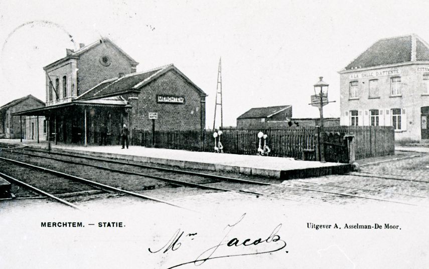 Reproductie van een postkaart met als opschrift ' Merchtem. - Statie. Uitgever A. Asselman-De Moor'. De postkaart toont de achter- en zijgevel van het station Merchtem. Onder de luifel van het eerste perron poseren enkele personen. Uiterst rechts is een openstaande overweg te zien. Onderaan de kaart bevint zich een handgeschreven naam.