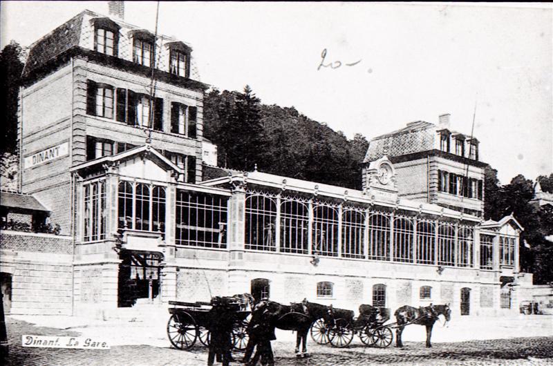 BeschrijvingReproductie van een postkaart met als opschrift 'Dinant. La Gare.' De postkaart toont de voorgevel van het station. Daarvoor staan twee paardenkoetsen en enkele mannen.