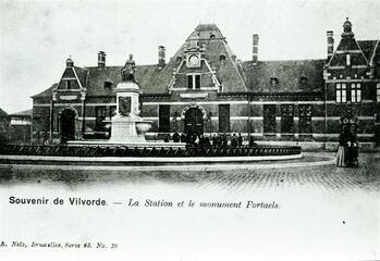 BeschrijvingReproductie van een postkaart met als opschrift 'Souvenir de Vilvorde. - La Station et le monument Portaels. E. Nels, Bruxelles, Serie 65. No 10'. Op de postkaart zien we de voorgevel van het station.