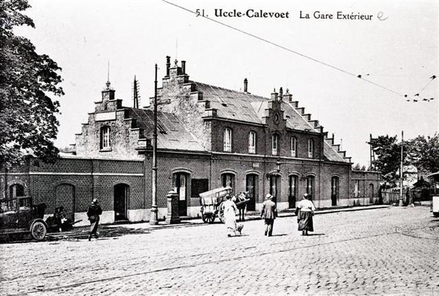 Reproductie van een postkaart met als opschrift '51. Uccle-Calevoet La Gare Extérieur'. De postkaart toont de voorgevel van het station. Op het plein voor het station zien we een auto, een paardenkoets en enkele voorbijgangers.