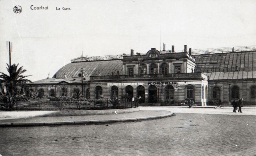 BeschrijvingReproductie van een postkaart met als opschrift 'Courtrai La Gare.' De postkaart toont de voorgevel en het stationsplein.