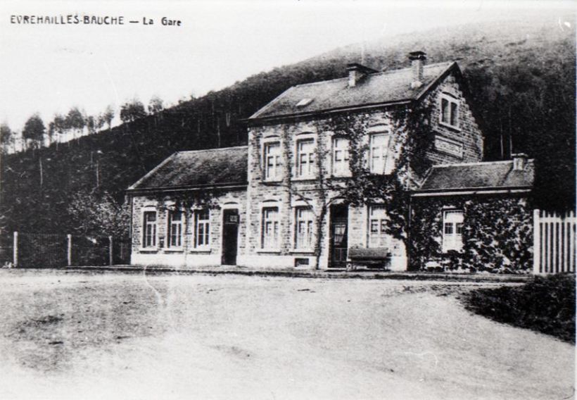 BeschrijvingReproductie van een postkaart met als opschrift 'Evrehailles-Bauche - La Gare'. De postkaart toont de voorgevel van het station.
