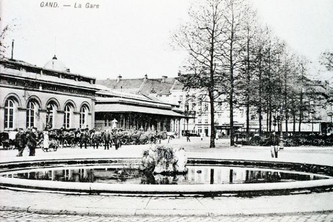 BeschrijvingReproductie van een postkaart met als opschrift 'Gand. La Gare'. De postkaart toont de voorgevel en de luifel van het stationsgebouw. Op het stationsplein staan verschillende paardenkoetsen en mensen.