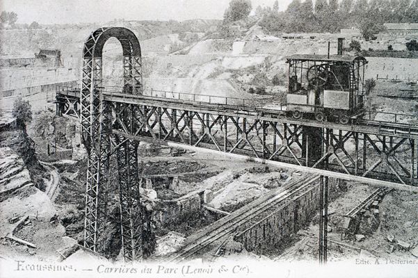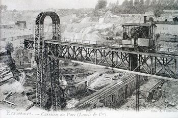 BeschrijvingReproductie van een postkaart met als opschrift 'Ecaussines. - Carrières du Parc (Lenoir & Cie)'. De postkaart toont een kleine stoomlocomotief die op een rail boven de mijn naar een toren rijdt.