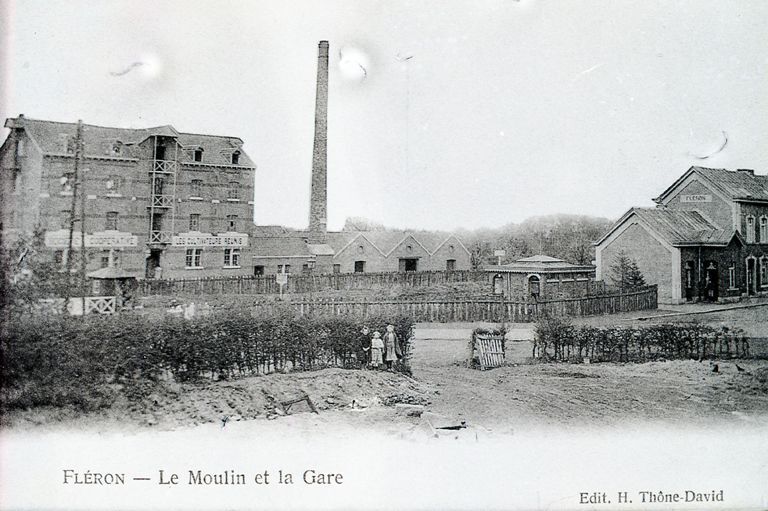 Reproductie van een postkaart met als opschrift 'Fléron - Le Moulin et la Gare Edit. H. Thône-David'. We zien een deel van de voor- en zijgevel van het station. Aan de overzijde van de sporen staat een fabrieksgebouw met hoge schouw en opslagplaatsen.