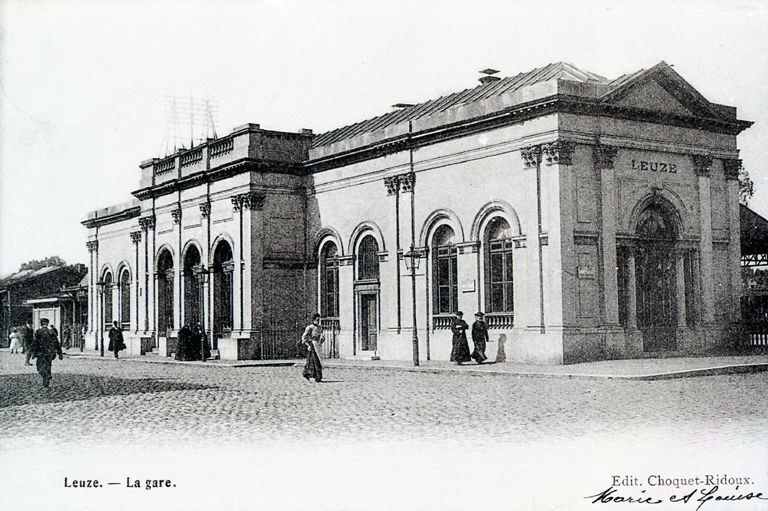 BeschrijvingReproductie van een postkaart met als opschrift 'Leuze. - La Gare. Edit. Cloquet-Ridoux.' De postkaart toont de voor- en zijgevel van het stationsgebouw. Voor het stationsgebouw lopen enkele mensen. De postkaart is rechts onderaan gehandtekend.