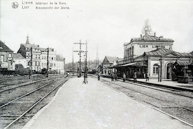 Reproductie van een postkaart met als opschrift 'Lierre Intérieur de la Gare. Lier Binnenzicht der Statie.' De postkaart toont de achter- en zijgevel van het station gefotografeerd vanop het het tussenperron. Op het perron staan twee mechanische seinpalen. Het stationspersoneel poseert op de sporen.