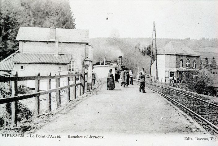 Reproductie van een postkaart met als opschrift 'Vielsalm. - Le Point d'Arrêt. - Rencheux-Lierneux. Edit. Baccus, Vielsalm'. De postkaart toont een perron met reizigers die wachten op een aankomende stoomtrein.