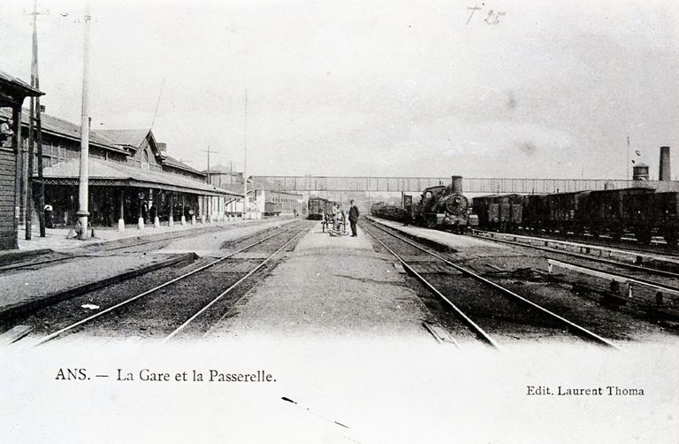 Reproductie van een postkaart met als opschrift 'Ans. - La Gare et la Passerelle. Edit. Laurent Thoma'. De postkaart toont de achtergevel van het station. Over de sporen loopt een gietijzeren voetgangersbrug. Aan één van de perrons staat een stoomlocomotief en een goederentrein. Drie mannen poseren op het middenste perron.