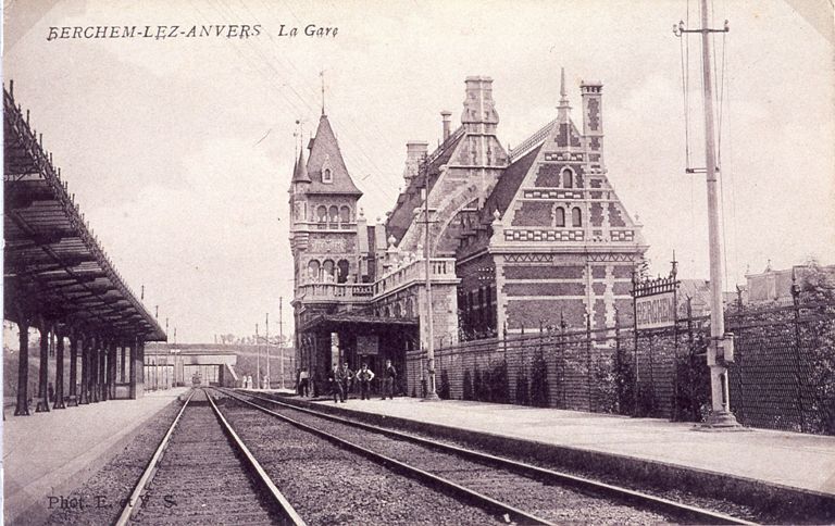 Reproductie van een postkaart met als opschrift 'Berchem-lez-Anvers La Gare Phot. E. et V.S.' De postkaart toont de achter- en zijgevel van het station, gefotografeerd vanop de sporen. Op het tussenperron staat een overkapping. Op het eerste perron poseert stationspersoneel.