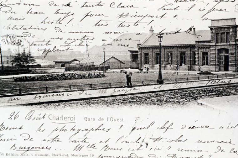 Reproductie van een postkaart met als opschrift 'Charleroi Gare de l'Ouest 3650 Edition Maison Dumont, Charleroi, Montagne 19'. De postkaart toont een deel van de voorgevel en het parkje voor het station. Boven en onder de afbeelding werd met de hand een boodschap geschreven.