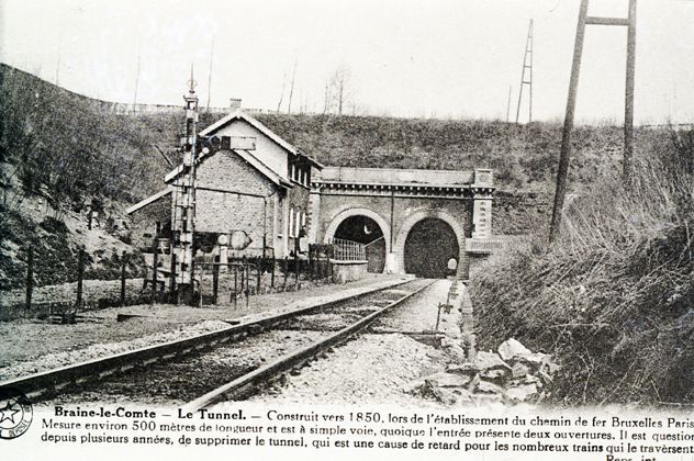 Reproductie van een postkaart met als opschrift 'Braine-le-Comte - Le Tunnel. - Construit vers 1850, lors de l'établissement du chemin de fer Bruxelles Paris. Mesure environ 500 mètres de longueur et est à simple voie, quoique l'entrée présente deux ouvertures. Il es que question depuis plusieurs années, de supprimer le tunnel, qui est une cause de retard pour les nombreux trains qui le travèrsent. Repr. int.' De postkaart toont de zuidelijke ingang van de tunnel, met twee kokers, waarvan slechts één in dienst was. De linkse koker was tijdens het bouwen in 1840-'41 immers ingestort. Links daarvan zien we een gebouw met ervoor een mechanische seinpaal.