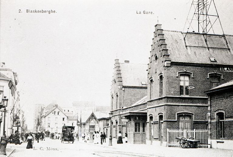 Reproductie van een postkaart met als opschrift '2, Blankenberghe. La Gare L. C. Mons.' De postkaart toont de voor-en zijgevel van het station. Op de straat voor het station lopen talrijke mensen.