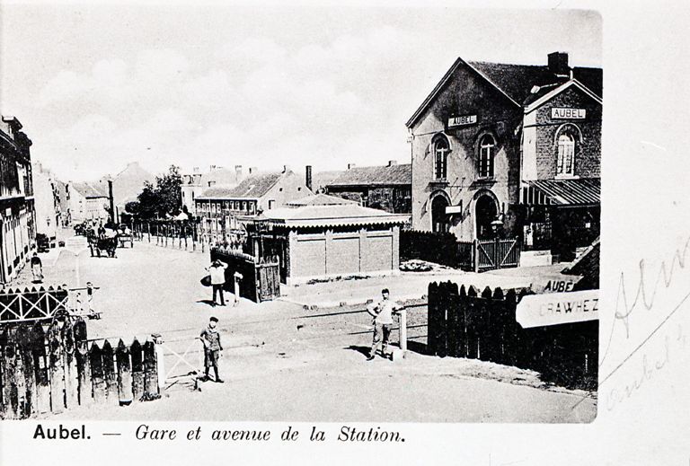 Reproductie van een postkaart met als opschrift 'Aubel. - Gare et avenue de la Station.' De postkaart toont een deel van de voor- en zijgevel van het station en de geopende overweg. Verschillende personen poseren aan de overweg. Op de postkaart staat rechts een handgeschreven boodschap.